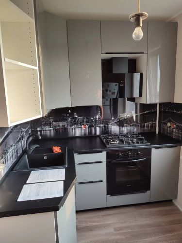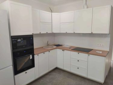 Соберём каркасы, навесим шкафы, дверцы и фурнитуру. Всё отрегулируем. Установим, мойку с сифоном и смесителем.